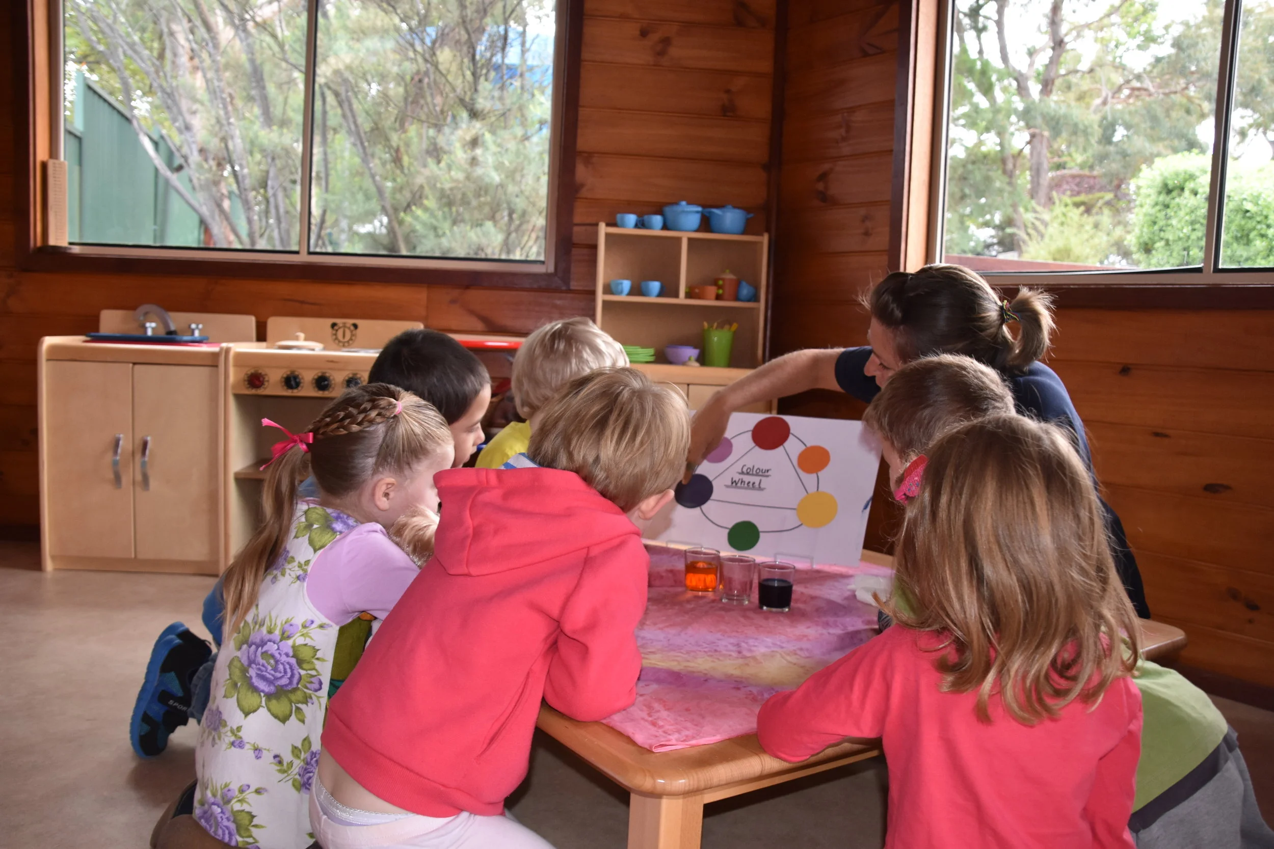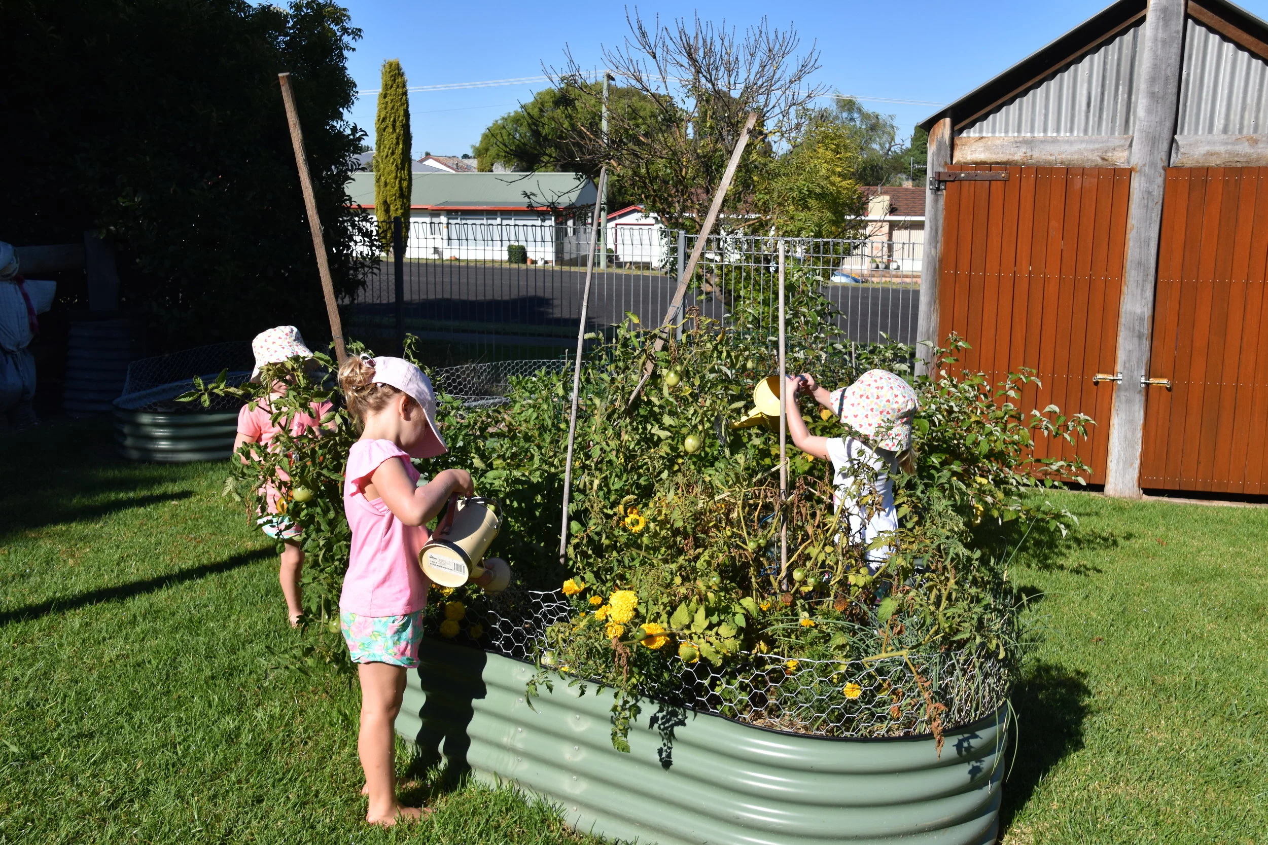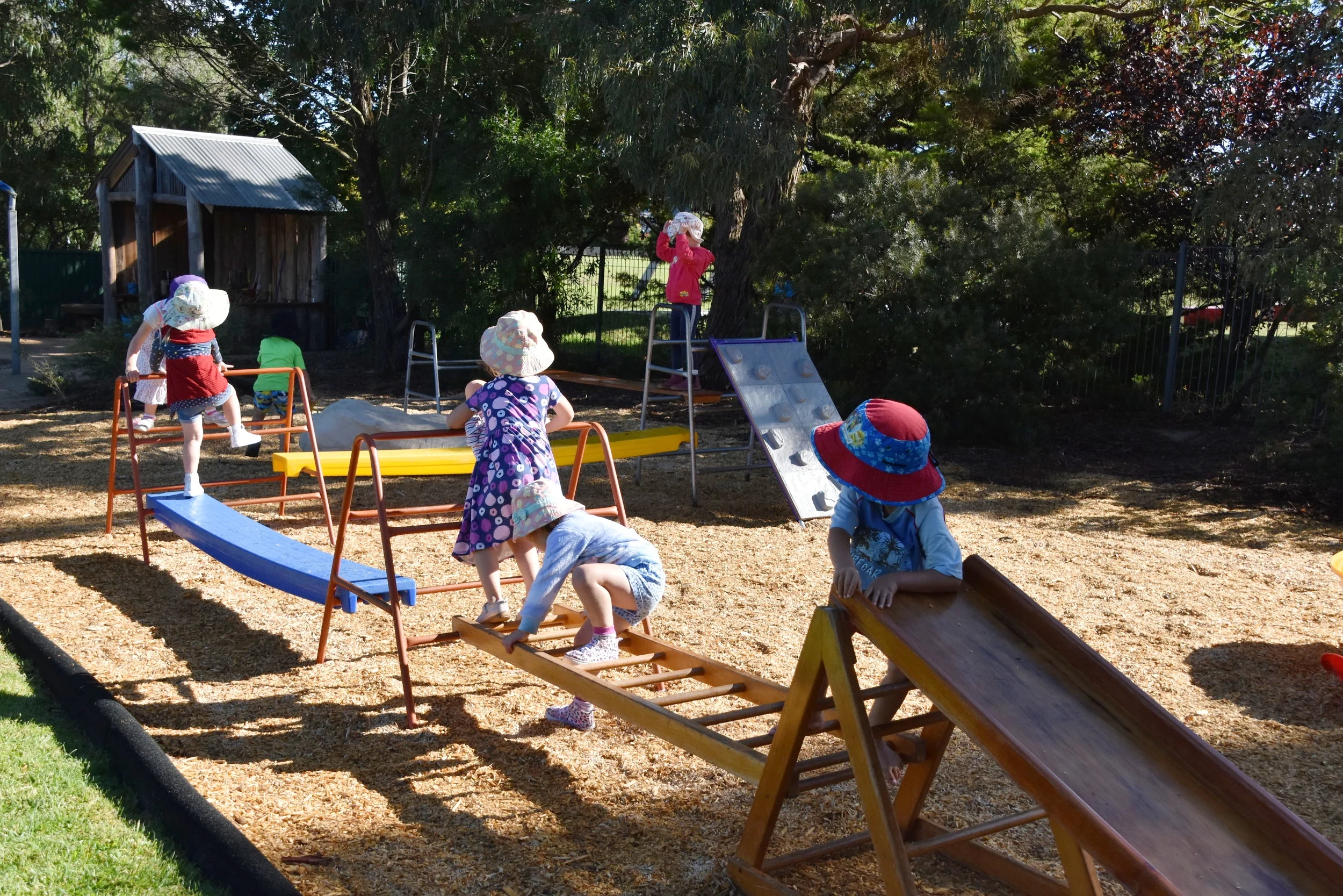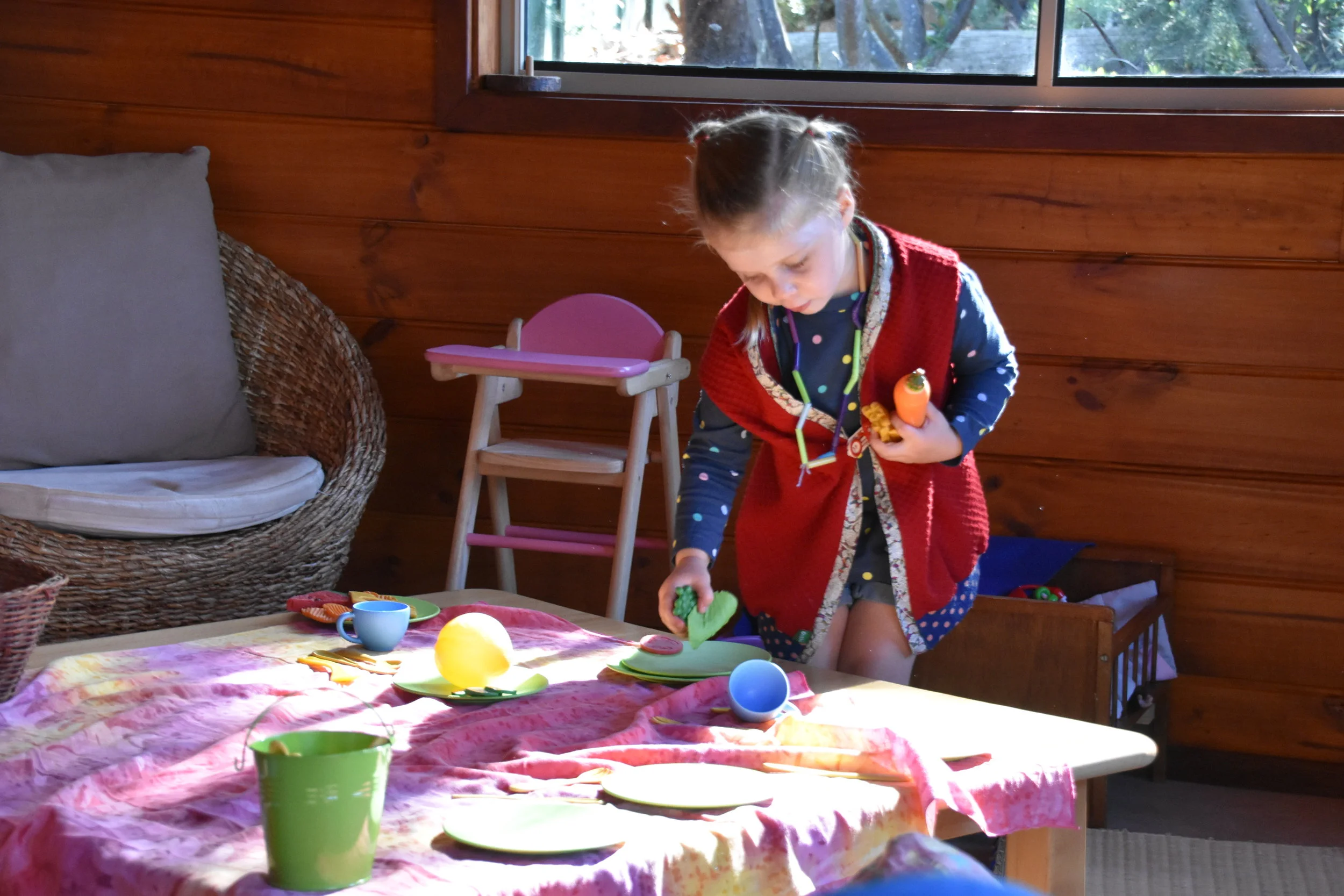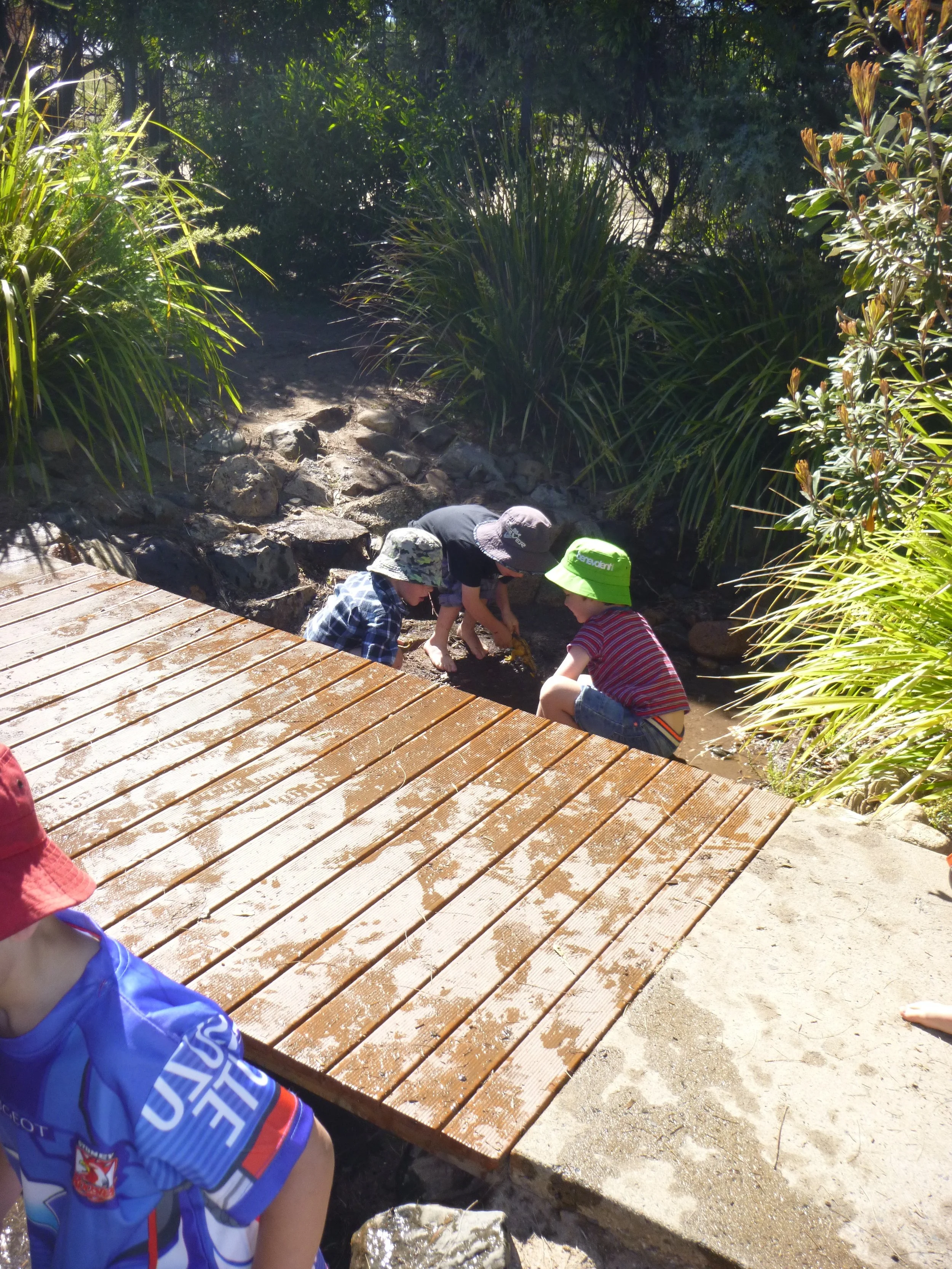 Our outdoor area is natural and spacious, inviting children to explore and discover while promoting opportunities for shared thinking and collaborative learning. It includes a log cabin, digging patch, sandpit, dry creek bed, hen house and vegetable garden. Children enjoy observing the variety of bird species that are attracted to many of our native trees and shrubs.