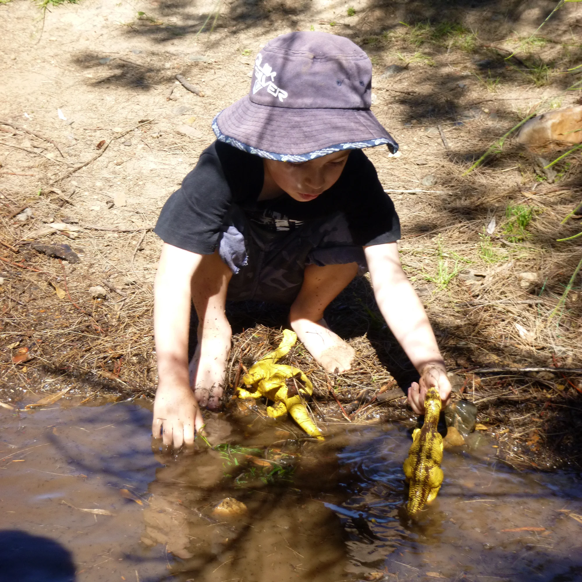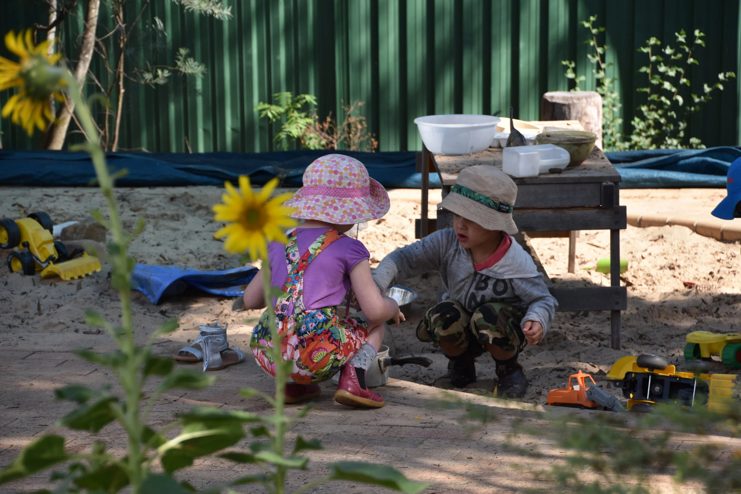 Our outdoor area is natural and spacious, inviting children to explore and discover while promoting opportunities for shared thinking and collaborative learning. It includes a log cabin, digging patch, sandpit, dry creek bed, hen house and vegetable garden. Children enjoy observing the variety of bird species that are attracted to many of our native trees and shrubs.